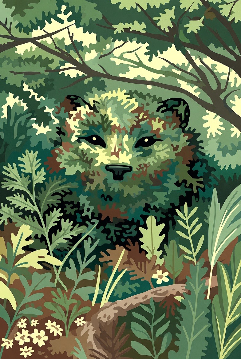 At first glance, this image looks like nothing more than a peaceful forest scene. Leaves, branches, and shadows blend together in soft green tones, creating what seems like a simple illustration of nature.