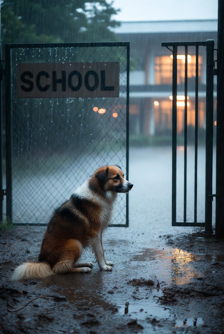 For days, staff at a local school noticed the same dog sitting quietly outside the gate. Whether it was sunny or pouring rain, he stayed in the same spot, watching the entrance as students arrived and left.