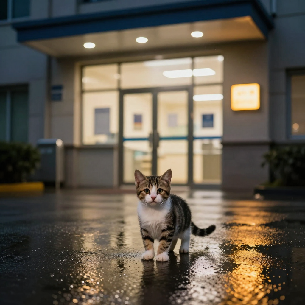 On a quiet evening, beneath the glow of hospital lights reflecting off wet pavement, a tiny kitten stood alone. No collar. No owner. Just a small life facing a big, uncertain world.