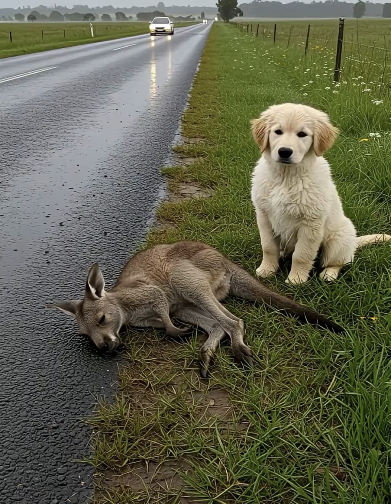 A quiet rural road turned into an unexpected rescue scene this week after a young Golden Retriever puppy stopped traffic to protect an injured baby kangaroo lying near the roadside.