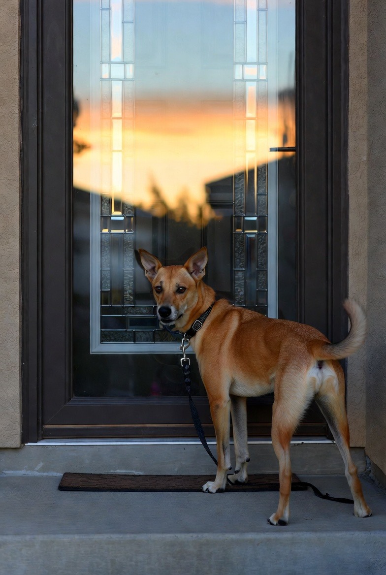 Every evening around sunset, neighbors began noticing the same quiet scene. A small brown dog would walk to the front door, sit for a moment, then turn back as if checking whether someone was coming. The leash still clipped to his collar suggested he had once belonged to someone who expected him home.