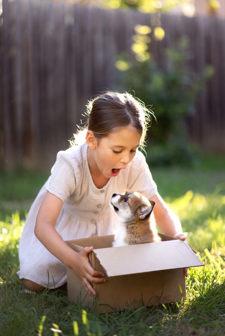 The girl gasped, her hands flying to her mouth in disbelief before she gently reached forward. The puppy leaned into her touch immediately, as if it already knew it had found its person.