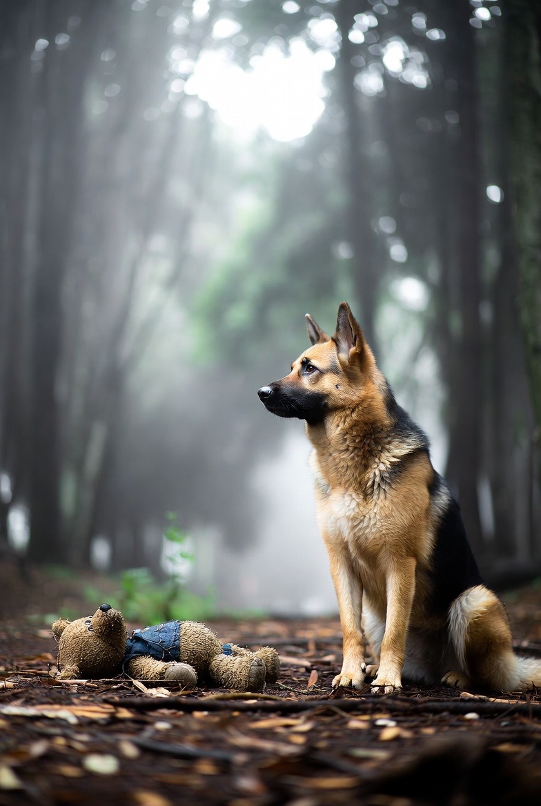 In the middle of a quiet, fog-covered forest, a German Shepherd was found sitting perfectly still. He wasn’t barking. He wasn’t wandering. He wasn’t searching for food.