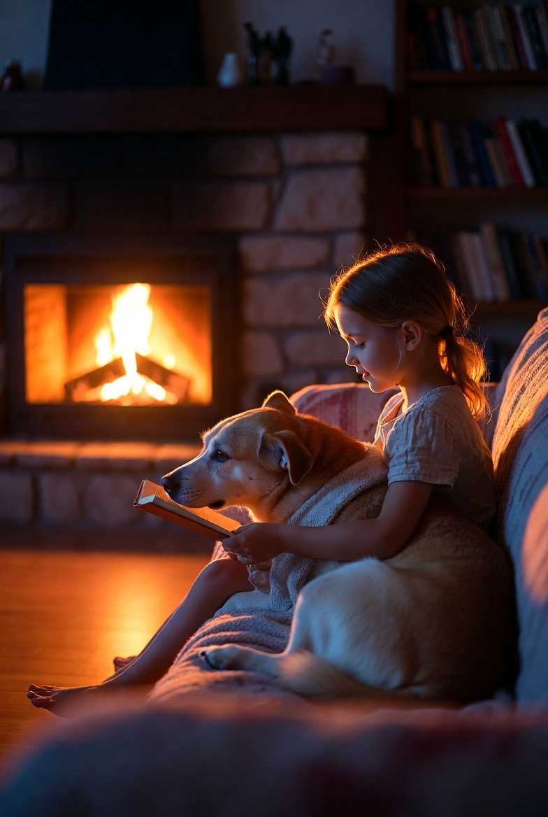 On a calm evening, as the fire flickered softly in the hearth, a young girl sat curled on the couch with her dog tucked closely beside her. Wrapped in warmth and silence, she read aloud from a small book, her voice gentle and steady.