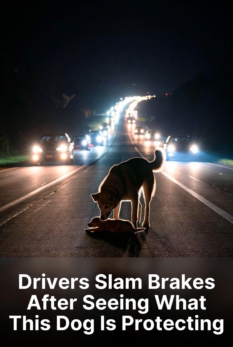 At first, motorists thought a stray dog had wandered onto the highway. But as cars approached and headlights lit up the scene, they quickly realized something far more emotional was happening.