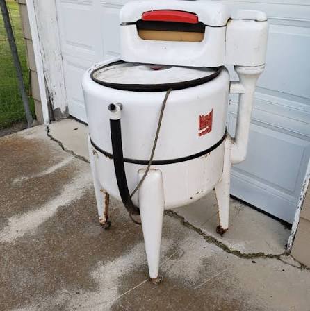 Back in the 1940s, 50s, and early 60s, laundry was a much more manual process. Clothes were washed inside the tub filled with water and soap, and then each item had to be passed through the rollers on top — called the wringer. The rollers squeezed out excess water before the clothes were rinsed or hung up to dry.