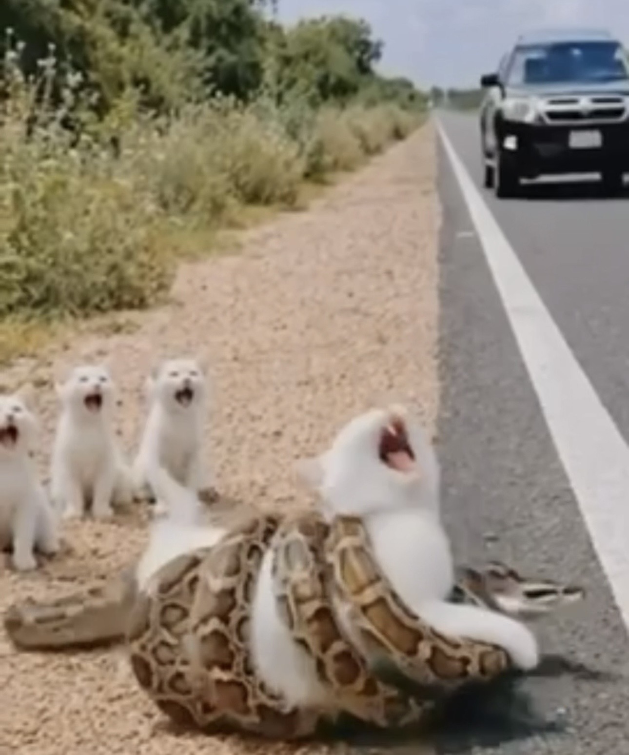 The frightened animal struggled to free herself as the snake tightened its grip. But what happened next stunned everyone watching from the roadside.