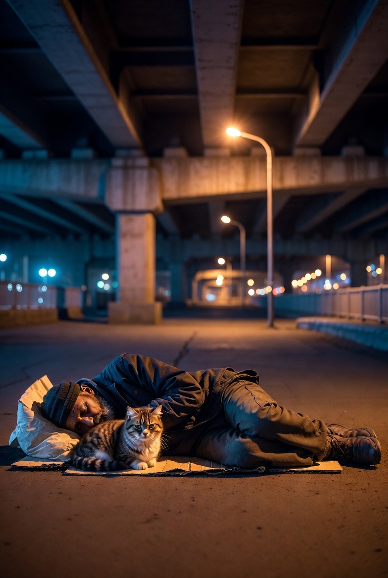 The cat stayed pressed against the man, sharing warmth during the cold night. Streetlights cast a soft glow under the bridge while the city continued moving in the distance.