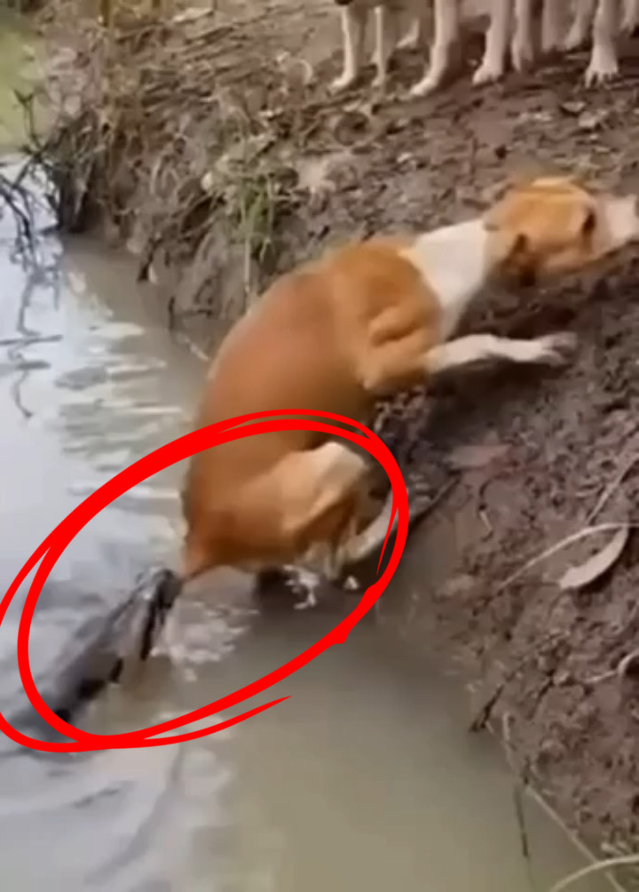 What started as a normal moment near a riverbank quickly turned into a heart-stopping scene. A mother dog and her small puppies were standing close to the water when a large snake suddenly appeared from the muddy river.