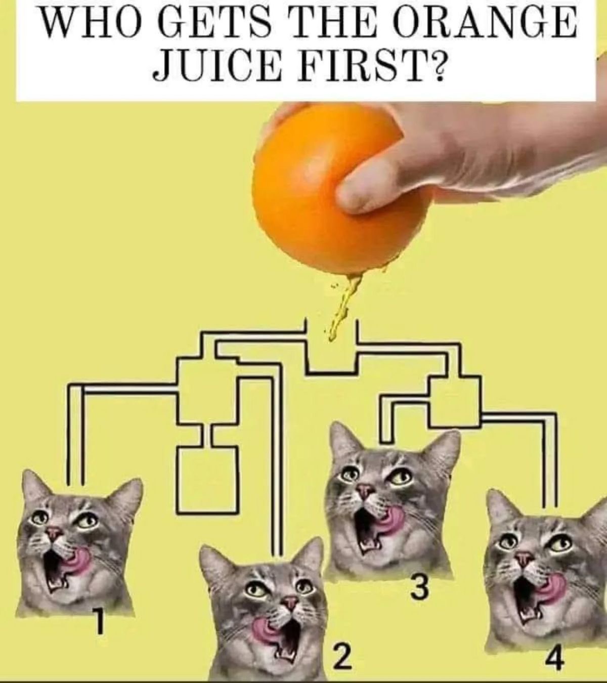This viral brain teaser has been confusing thousands of people online, and at first glance, it seems incredibly simple. A freshly squeezed orange is dripping juice into a network of pipes that lead to four different cats. The challenge is to determine which cat will receive the juice first.