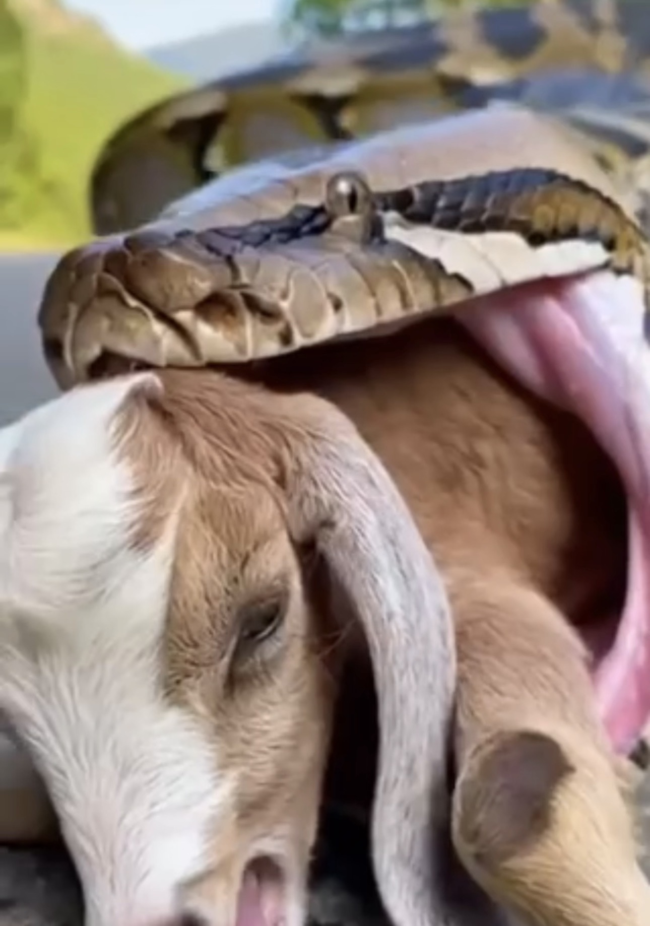 Cars had just passed moments before. Dust still hung in the air when a baby goat wandered a little too far from its mother. That’s when the movement came — fast, silent, and terrifying. A large snake struck, wrapping itself around the small goat before anyone nearby even realized what was happening.