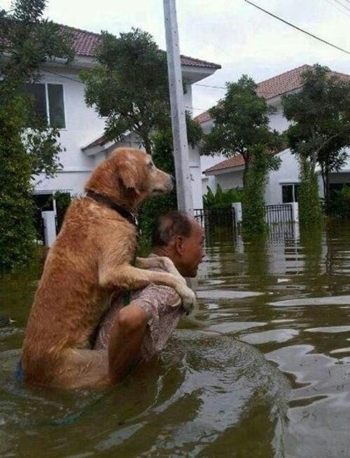 As they moved through the water, the dog didn’t panic. He didn’t struggle. Instead, he stayed completely still—resting his paws gently on the man’s shoulders, almost like he understood exactly what was happening.