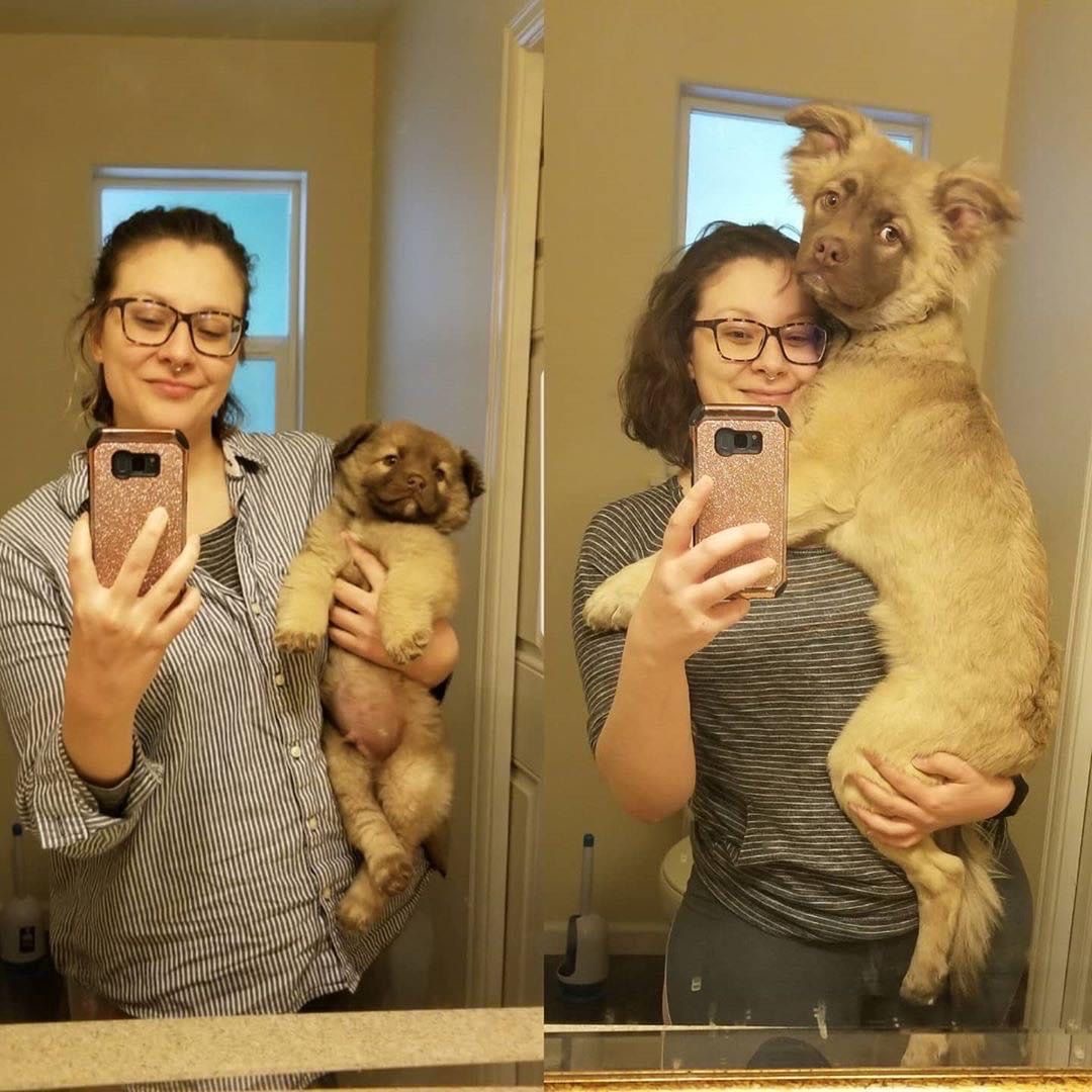 A woman holding her small puppy in front of a mirror, smiling softly as she captured the moment. The puppy looked tiny in her arms—round, fluffy, still figuring out the world.