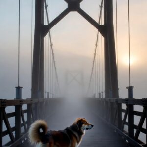 In the early hours of the morning, a lone dog was seen standing on a suspension bridge swallowed by fog. There were no cars. No people. Just…
