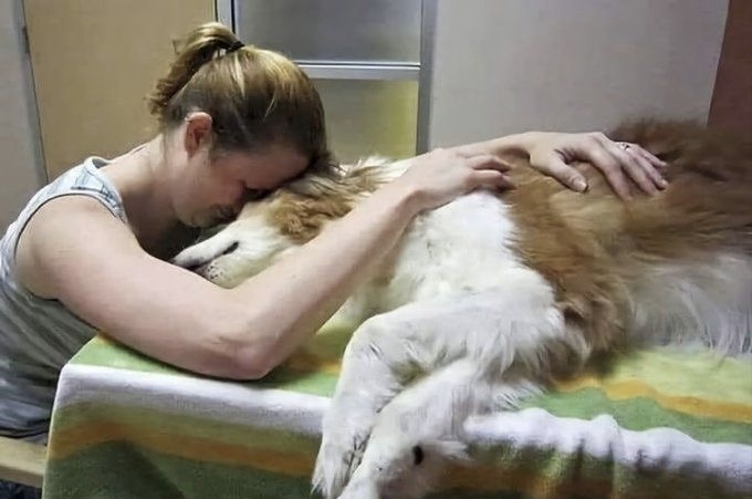 She leaned forward, resting her head gently against her dog’s. One hand wrapped around him, the other trembling slightly as she tried to hold on — just a little longer.