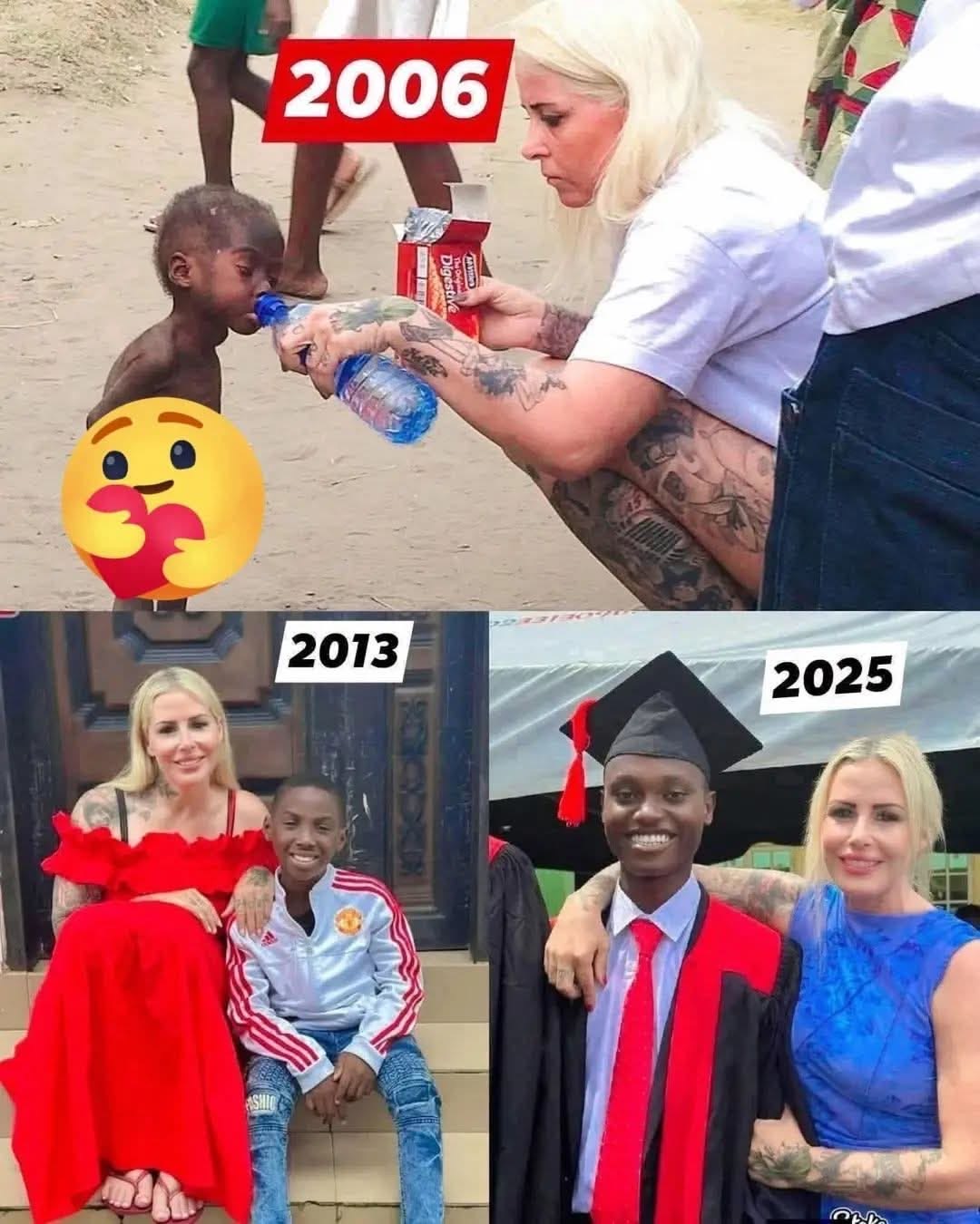 In 2025, he stood proudly in a graduation gown—confident, accomplished, and transformed. The same woman who once helped him take his first steps toward survival stood beside him again, this time witnessing his success.