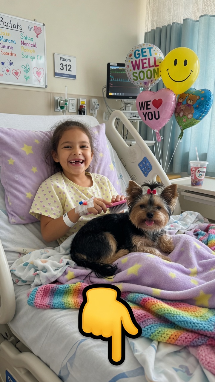 hospital room 312, a brave young girl is undergoing treatment, but she never loses her smile thanks to her little Yorkshire Terrier.