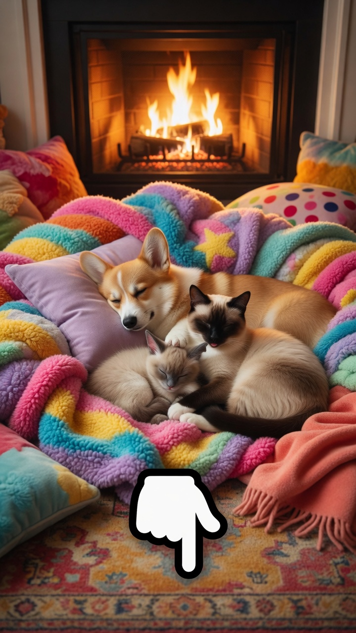 In front of a crackling fireplace, a gentle Corgi lies peacefully surrounded by two Siamese cats — one adult and one tiny kitten — all wrapped up on a colorful blanket. The warm firelight glows on their relaxed faces as they share the ultimate cozy spot.