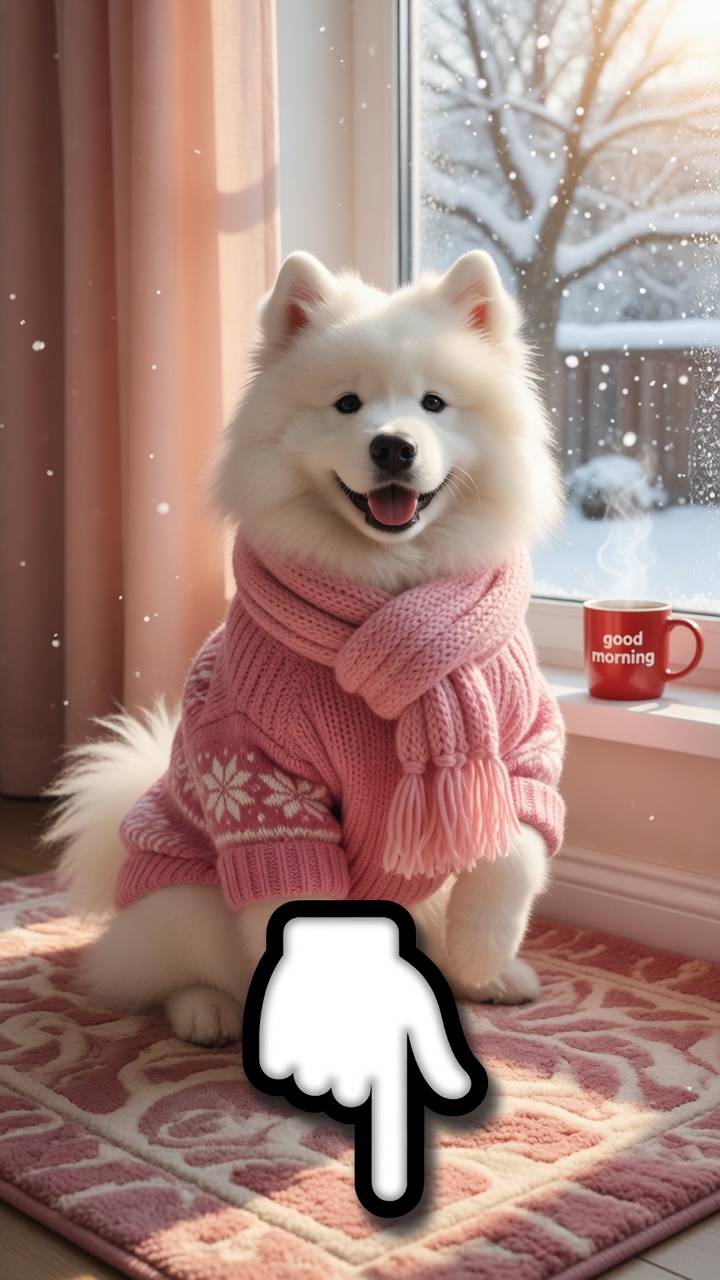 In a warm and cozy room with soft morning light, this happy white Samoyed sits proudly on a pink rug wearing a knitted sweater and matching scarf. Outside the window, snowflakes fall gently while a steaming “good morning” mug sits on the sill.