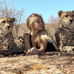 At first glance, it doesn’t seem real. A woman lying calmly on the ground… with two full-grown cheetahs resting beside her. No fear. No movement. Just stillness….