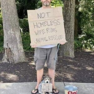 At first glance, it doesn’t make sense. A man stands on the sidewalk holding a cardboard sign that clearly says: “NOT HOMELESS. WIFE RUNS ANIMAL RESCUE.” So…