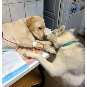 In a quiet veterinary room, a moment unfolded that perfectly captured what loyalty truly means. One dog lay gently on the table, hooked up to treatment, clearly…