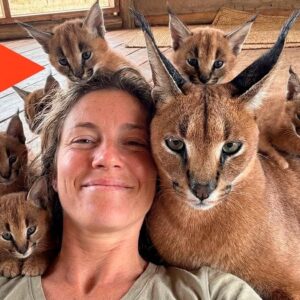 At first glance, it looks like a peaceful moment—a woman lying beside a beautiful wild cat surrounded by adorable kittens. But this photo tells a much deeper…