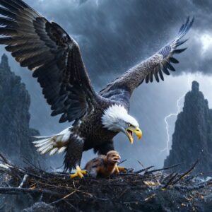 Mother Eagle Spreads Her Wings to Protect Chick During Violent Storm