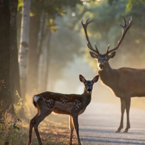 Protective Stag Stands Guard as Young Fawn Crosses Quiet Forest Road