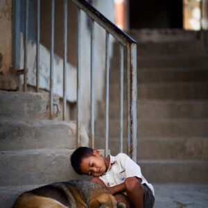 Stray Dog Keeps Lonely Child Company on Quiet Neighborhood Staircase