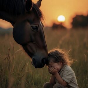 Gentle Horse Comforts Crying Child During Quiet Sunset in the Field