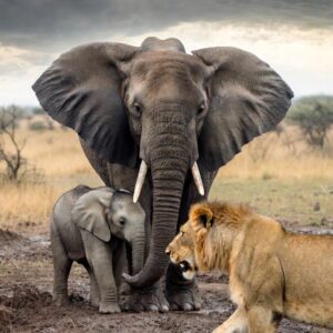 Mother Elephant Stands Fearlessly Between Lion and Her Baby in Dramatic Wildlife Encounter