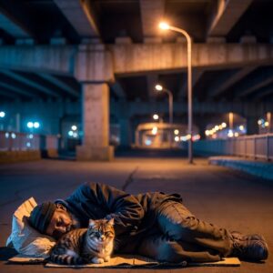 Homeless Man and Loyal Cat Sleep Together Under Bridge