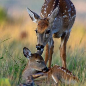 In a quiet grassy field, a powerful moment between a mother and her newborn fawn unfolded. The young fawn lay resting in the grass, still small and…