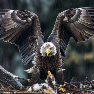 Bald Eagle Spreads Its Wings to Protect Chick During Heavy Rainstorm