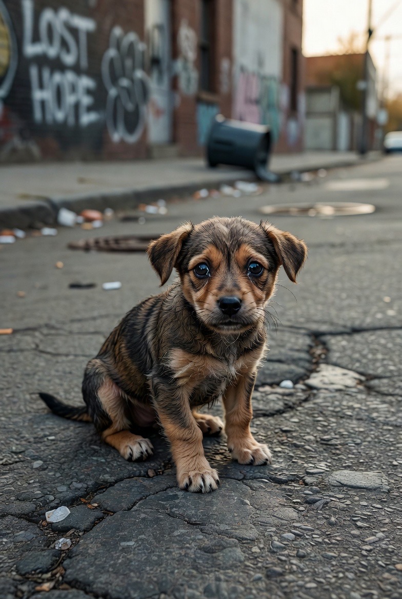 A heartbreaking photo of a small puppy sitting alone on a quiet city street is drawing attention online, with many viewers moved by the animal’s vulnerable expression….